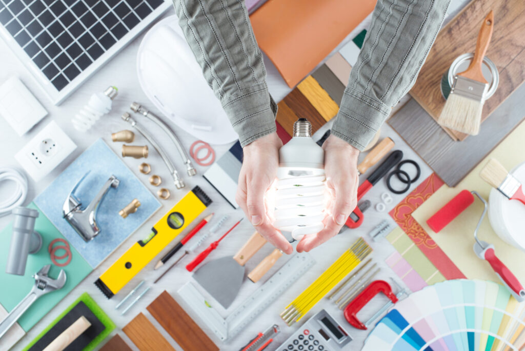 Man's hands close up holding a CFL energy saving lamp, work and repair tools on background, top view